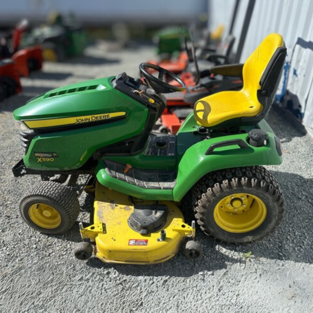 The John Deere X590 combines power, precision, and comfort. Equipped with a strong engine and power steering, it delivers exceptional mowing performance and easy handling, even on slopes. A reliable and durable choice for maintaining large properties.